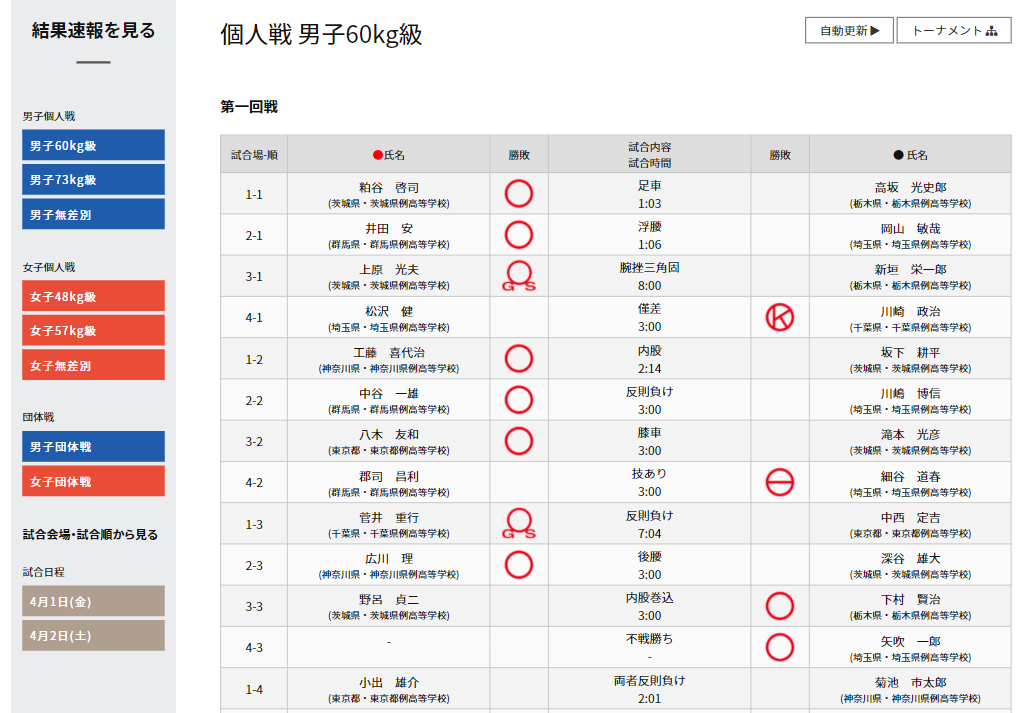 試合結果入力を進めて行くと同時に、下図のようにサイト上ではトーナメント表の勝ち上がりも反映されています。
