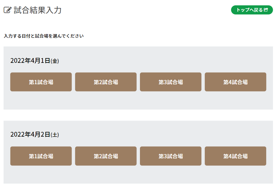 下図のように、日付ごとに試合場のボタン一覧が表示されますので、入力したい試合場のボタンを選択してください。